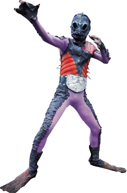 Amazonia (アマゾニア 22) - A piranha monster. He can launch his nails as projectiles and move through the water. Led an underwater mining Shocker base. His personal emblem, worn on his Combatmen' masks, is a fish wrapped around itself to make a circle. Captured and modified swimmers with exceptional stamina, with his activities were eventually discovered by the FBI and Kamen Rider 2. Destroyed by Kamen Rider 2's Rider Kick.