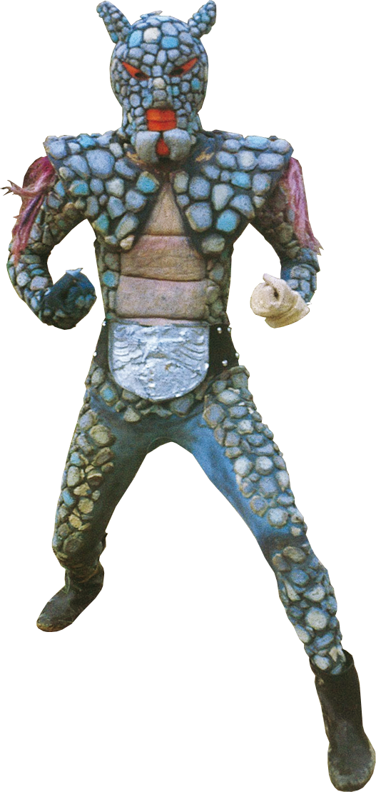 Armadillong (アルマジロング, Arumajirongu, 33, 37, 41 & Rider vs Shocker) – An armadillo monster. His personal emblem was a silhouette of his own face. He was able to turn into a ball and crash into foes with explosive force, and was well-armored enough to be impervious to Kamen Rider 2's Rider Kick, but his belly was not as strong as his other body parts. Tested by Shocker's Brazilian branch, he was sent to Japan to work under Colonel Zol and fight against Kamen Rider 2. In his original test, he slaughtered a family, leading the surviving woman, Connie Yamada, to go after him for revenge. He was destroyed by Kamen Rider 2's Rider Kick on his belly.
