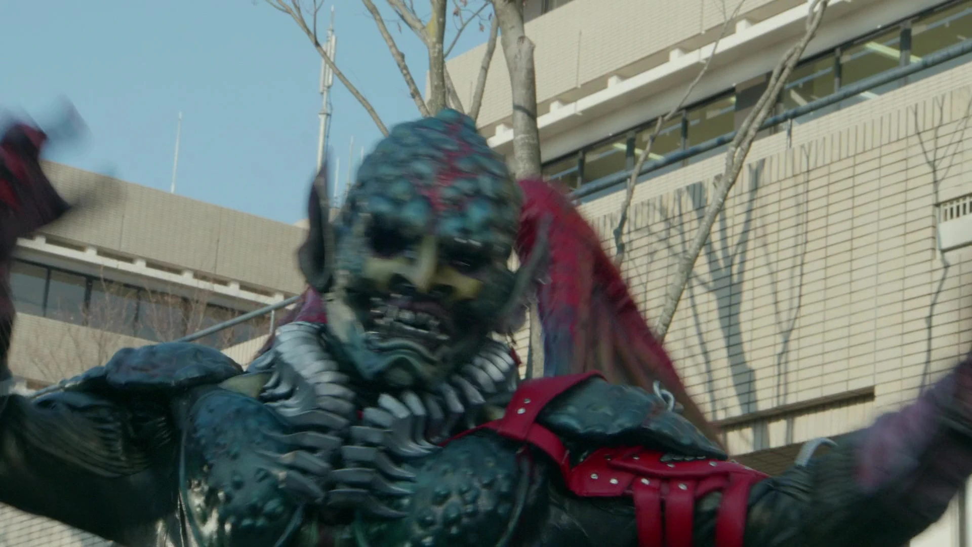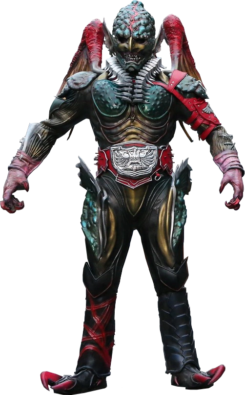 He is destroyed by Ghost's Omega Break finisher with the Gan Gun Saber in Blade Mode. [Kamen Rider 1 (film)]
