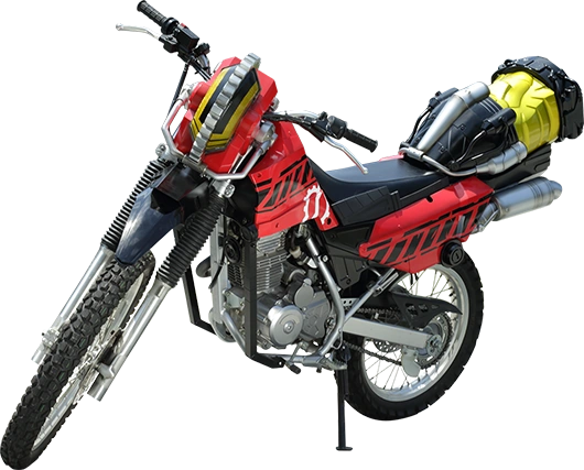 The Machine Builder is equipped with GPS navigation and is equipped with High Balancer Tires (ハイバランサータイヤ, Hai Baransā Taiyasu) that have a multi-directional air injection system. This allows the bike to remain perfectly balanced and at full speed can run up and down slopes, the sides of buildings or the Sky Wall. The Front Gear Light (フロントギアライト, Furonto Gia Raito) on the handle bars is equipped a high beam headlight along with thermal and infrared sensors to see enemies in the dark or in hidden areas. The Front Gear Light can also extend outward for combat use, rotating at high speed like a buzzsaw and using an unnamed Rider Break attack to ram right through objects or a large enemy such as the Guardian Union State mechas. The Guard Red Cowl covering the bike is made from a special armor material that is super durable and protects the internal components of the bike from damage, able to withstand any attack by a Smash. The Machine Builder's seat cushion is automatically adjustable to provide its occupants with a comfortable ride and adjusts to negate some of the force of impact from rougher travel on uneven terrain, during a battle or from high jumps.
