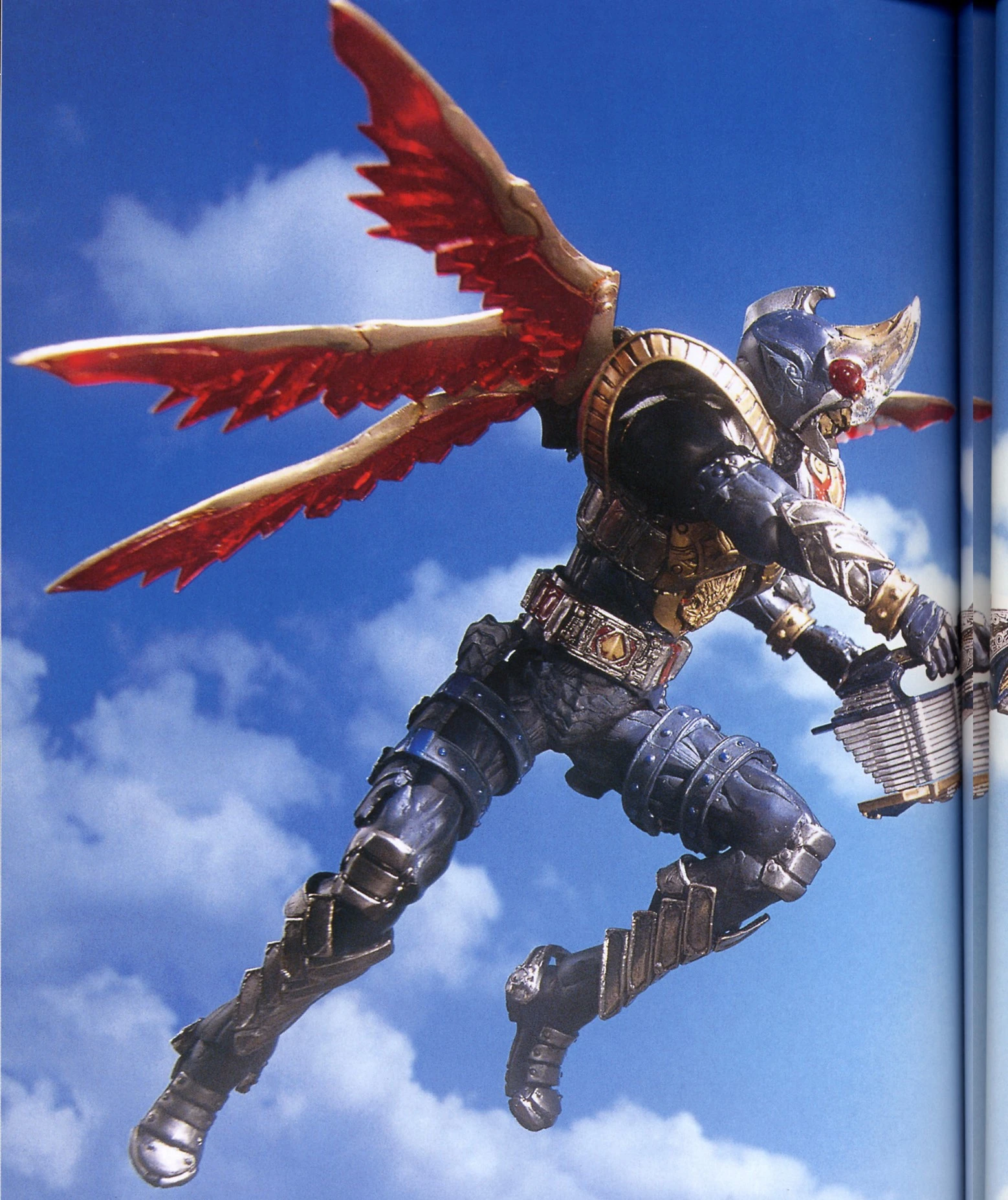 The Jack Form is a combat extension of the Rider System which harnesses the power of Category Jack Rouse Cards (in this case, the ♠Jack: "Fusion Eagle") via the Rouse Absorber. Initiating Blade's Jack Form transmogrifies the Rider Armor with the attributes and characteristics of the Eagle Undead DNA with the ♠J's "FUSION JACK" effect, effectively enhancing Blade's natural combat capacities. Blade's Jack Form imparts a number of enhancements; the first being the enhancement of the Blay Rouzer through a blade extension. Outside of this cosmetic appendage, the Blay Rouzer essentially functions the same. The second advancement is the addition of reinforced golden-armor plating which increase resilience to impact damage. But the most drastic modification is the inclusion of wings, which enables flight for the Rider.