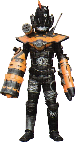 The Gekitotsu Robots Gashat arms this Bugster with raw physical strength. Its right fist can be launched and fly to hit far away targets before returning.