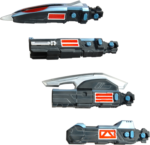 - SavageGasher (Kamen Rider Yuuki Hijack Form) - Two DenGasher units combined into one giant sword with dual axe parts exposed.