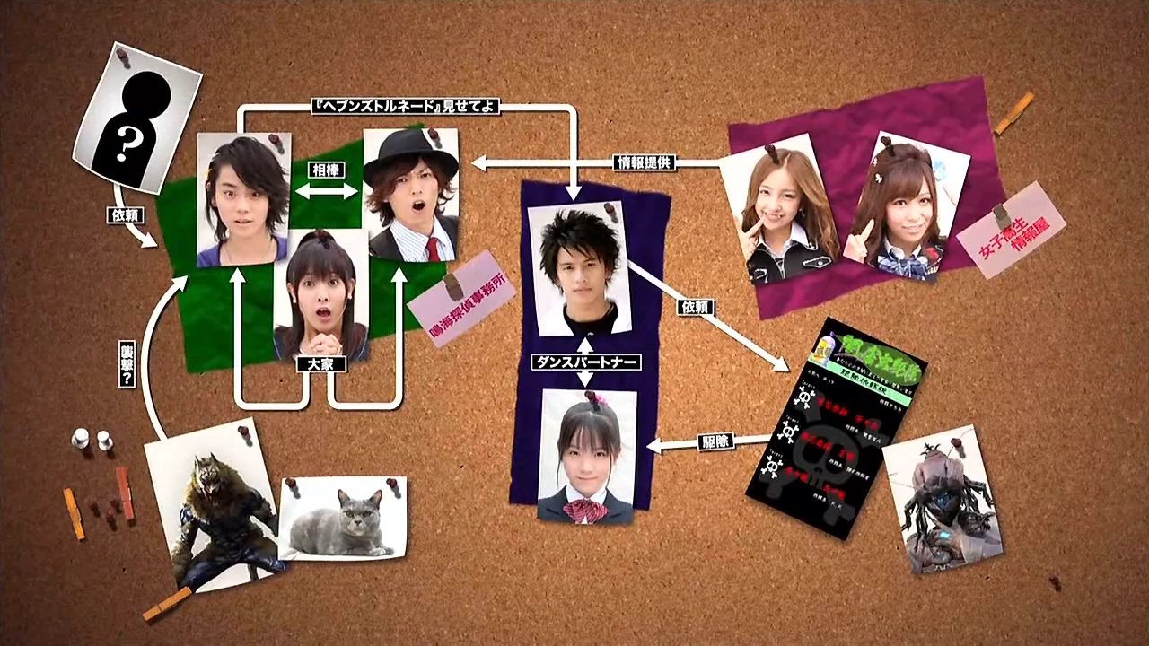 Later, brought to the Narumi Office by Shotaro, Dango reveals he was the one who threw the rock and that he posted on the Dark Big Extermination out of venting his rage when he and Chizuru broke up as she joined the swimming team without explaining herself. As Philip looks up Chizuru's reason through the Gaia Library, Shotaro meets up with Santachan for information about Cockroach Dopant, giving him a self-published manga that leads him to dōjinshi artist Ikari.