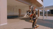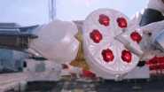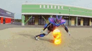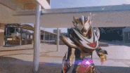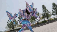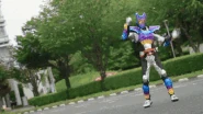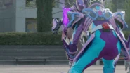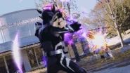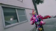Unnamed Rider Shooting: Gavv spins the blue Wheeloop three times, extending two support rods from the bottom of the Vrocangatling to steady it. He pulls the trigger to fire a barrage of hard candy bullets which swerve around in midair before they strike and destroy the enemy.