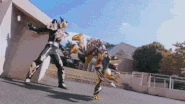 - Rider Punch and Rider Kick combo: Gavv summons numerous onomatopoeia symbols as he starts his attack, kicking his opponent and sliding from them as he bounces off of them each, delivering numerous kicks and punches, before uppercutting his enemy, getting into a stance and delivering one final kick.