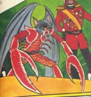 Ganikoumoru (ガニコウモル, Ganikōmoru, 78-80) - It was initially a mysterious crab/bat monster which appeared during Shocker's last days, foreshadowing the rise of a new threat. Ganikoumoru was the only Geldam monster that actually appeared in the series, before the organization became the new leadership of Gel Shocker.