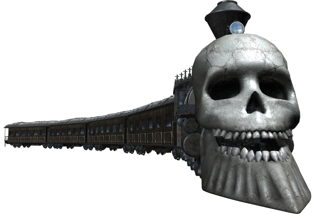 Ghost Train (幽霊列車, Yūrei Ressha) is a skull-faced steam-engine that transcends the world of the dead and the flow of time. [Saraba Kamen Rider Den-O: Final Countdown] This train was stolen by Shiro in order to tamper with time so that he and his wife Sora could live again. When Shiro was defeated Sora used her tickets so that they could finally rest in peace in the world of the dead.