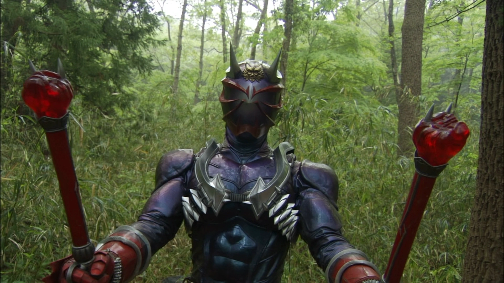 Just like the original Kamen Rider Hibiki, the current incarnation simply needs to tap his Onkaku against a solid surface, the vibrations from the fork causing his body to be engulfed in a fiery purple aura and assume his Oni form. Using his Ongekiko Kaendutsumi buckle in conjunction with his Ongekibou Rekka drumsticks, Hibiki can execute his Ongekida attacks.
