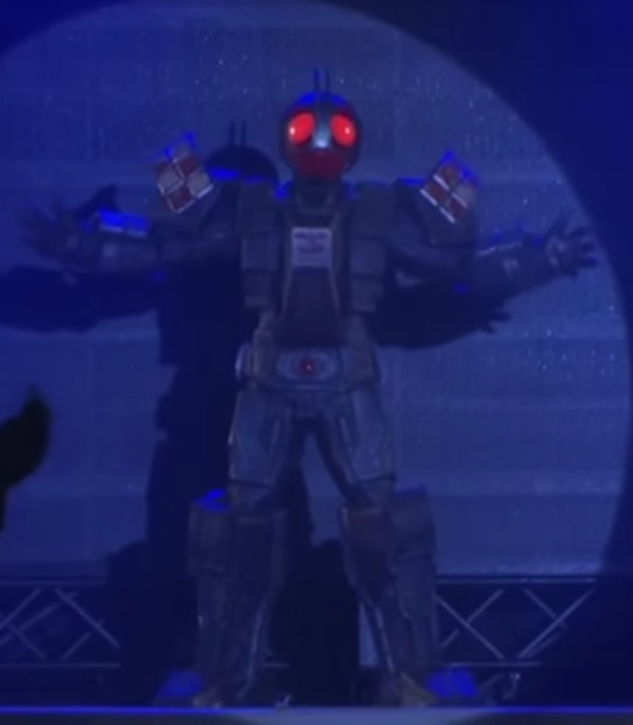 . All previous giant villains from the first Super Hero Taisen film (Big Machine) and Kamen Rider Taisen (the Generalissimo of Badan) were CGI characters. - Rider Robo claims to be the strongest Shocker Rider in history, so in a sense, it can also be regarded as one of Debatable Riders.