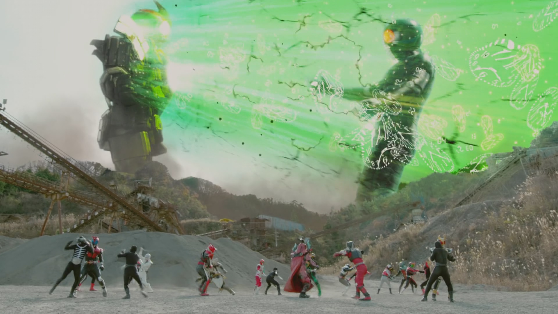 The Rider Robo stops moving and the OOO Driver disappears, however he soon restarts and absorbs Diend, transforming into a gigantic Demonic Diend. The Rider Robo then uses Kaijin Rides to summon Rock Great Leader, King Dark, Neo Shocker Great Leader, and Skeleton Dinosaur. At that moment, Takatora Kureshima as Kamen Rider Zangetsu launches an army of Kurokage Troopers Suika Arms to fight the giants, many of which sacrifice themselves by entering the giants' mouths and blowing themselves up.