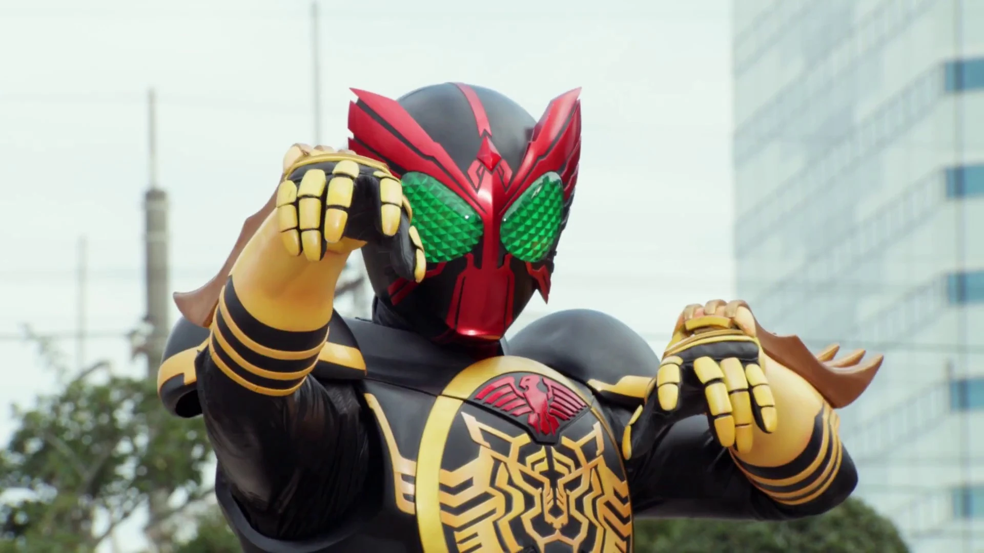 A manifestation of Kamen Rider OOO (仮面ライダーOOO(オーズ), Kamen Raidā Ōzu) was summoned along with Double and Fourze from the Game Area generated by the Ganbarizing Gashat which had been installed into a Collabos Bugster by Kamen Rider Genm who, as Emu Hojo noted, controlled them like game characters. Advancing on Emu, the three Riders were held off by the sudden arrival of "Dr. Pac-Man", [Part. I: Legend Rider Stage] who fired at them with his Gashacon Bugvisor to cover his escape with Emu. Catching up with Emu and "Dr. Pac-Man" now joined by Hiiro Kagami and Taiga Hanaya, Genm's Riders met the three doctor Kamen Riders in a skirmish while Genm himself pursued "Dr. Pac-Man", with OOO engaging Snipe Shooting Gamer before facing Brave Famista Quest Gamer in a Game Area generated when the doctors used the Bandai Namco Gashats provided to them by "Dr. Pac-Man". Acting as a batter supported by a team of Bugster Viruses, OOO was outmatched by the pitcher Kamen Rider Brave who ultimately defeated him and his team with Famista's Critical Strike. [Part. II: Legend Gamer Stage]