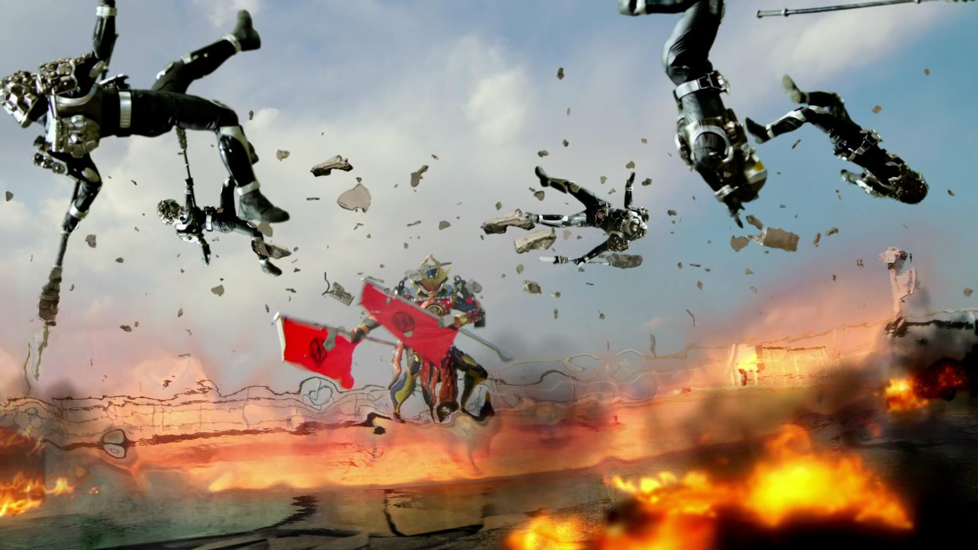 The Kurokage Troopers are blown away by the might of Gaim's Kachidoki Arms.