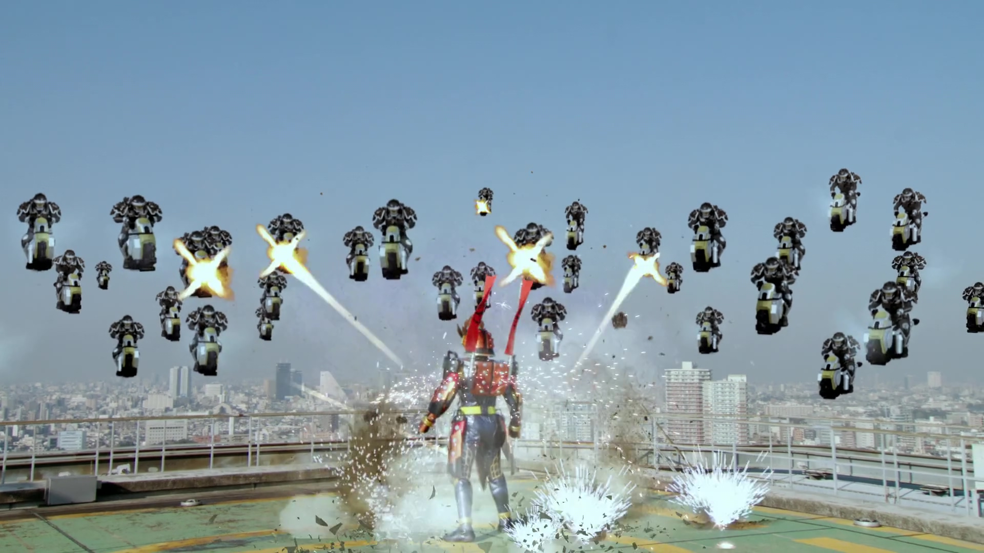 When Gaim landed on top of Yggdrasill Tower in his new Kachidoki Arms, ready to destroy the Scalar System, a group of dozens of Kurokage Troopers on Dandeliners came to stop him. They began bombarding him with gunfire from a distance but were unable to pierce his extremely powerful armor. Pulling out Kachidoki Arms' weapon, the Hinawadaidai-DJ-Ju, Gaim fought back against the Kurokage Troopers who tried to encircle him but were all taken down with their Dandeliners destroyed. A remaining group of Kurokage Troopers came up on the roof and tried to fight him but were quickly blown away by his battle flags.[Now Depart for the Front Line! Kachidoki Arms!]