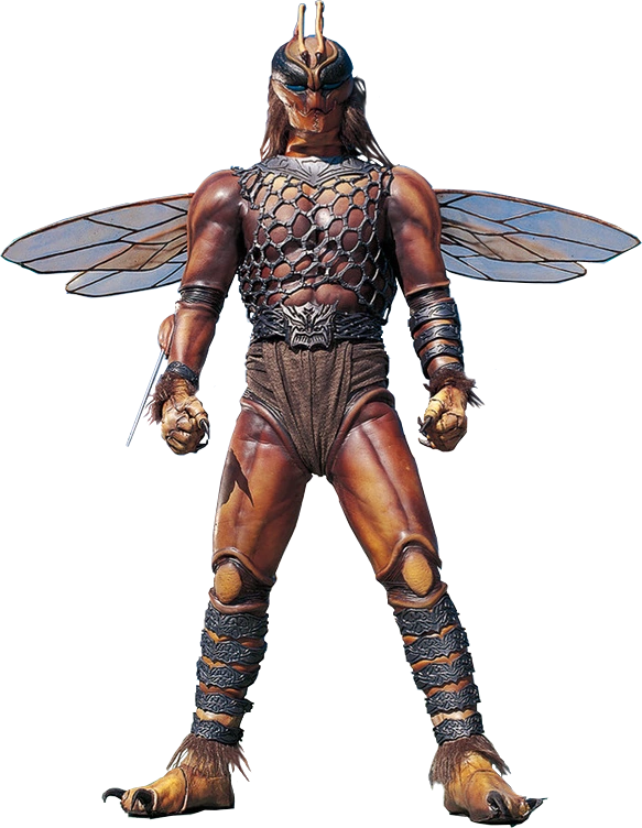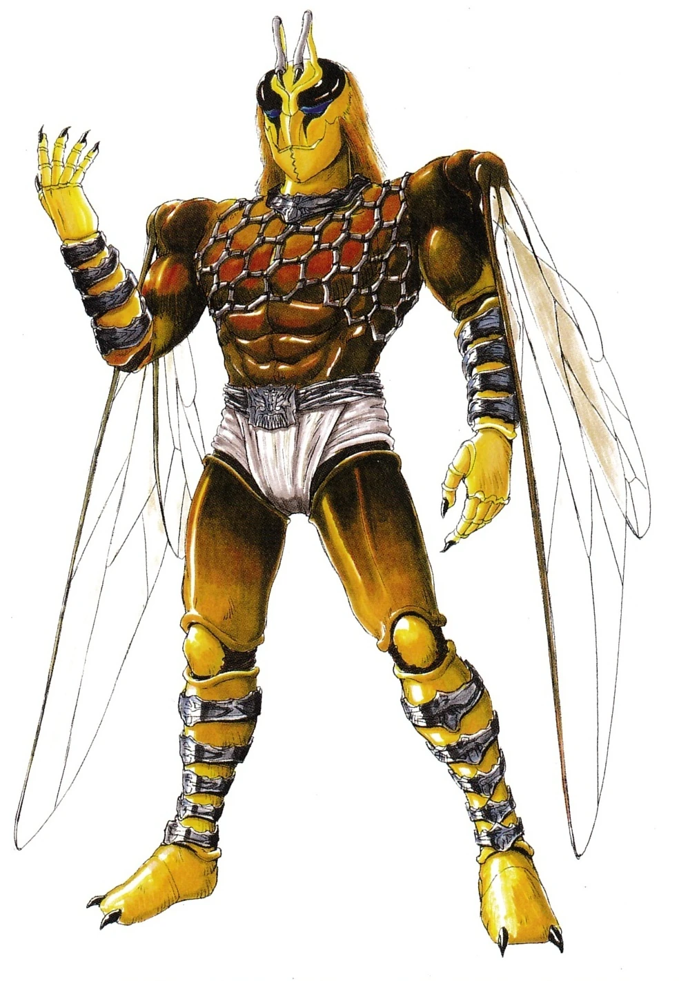 Me·Vagis·Ba[src] (メ・バヂス・バ, Me Bajisu Ba)[1] is a wasp-like Gurongi that is labeled Unidentified Lifeform #14 (未確認生命体第14号, Mikakunin Seimeitai Dai Jūyongō) by the police. Vagis was first of the Me Group to join the game and fly at speeds up to 200 km/h, he assumes the form of a young man in a yellow jacket. Vagis uses the stingers from his wrists to execute vertical sniping from high in the sky, with the victim dying from fatal anaphylactic shock. However, Kuuga intervenes, which forced Vagis to leave his bracelet behind as Kuuga pursed him.