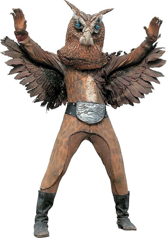 Owl Man (フクロウ男, Fukurō Otoko, 60) - An owl monster of Shocker. He was able to fly during night and could emit x-rays from his eyes strong enough to reduce hmans to skeletons. He was destroyed by Kamen Rider #1's Rider Hammer and Rider Kick.
