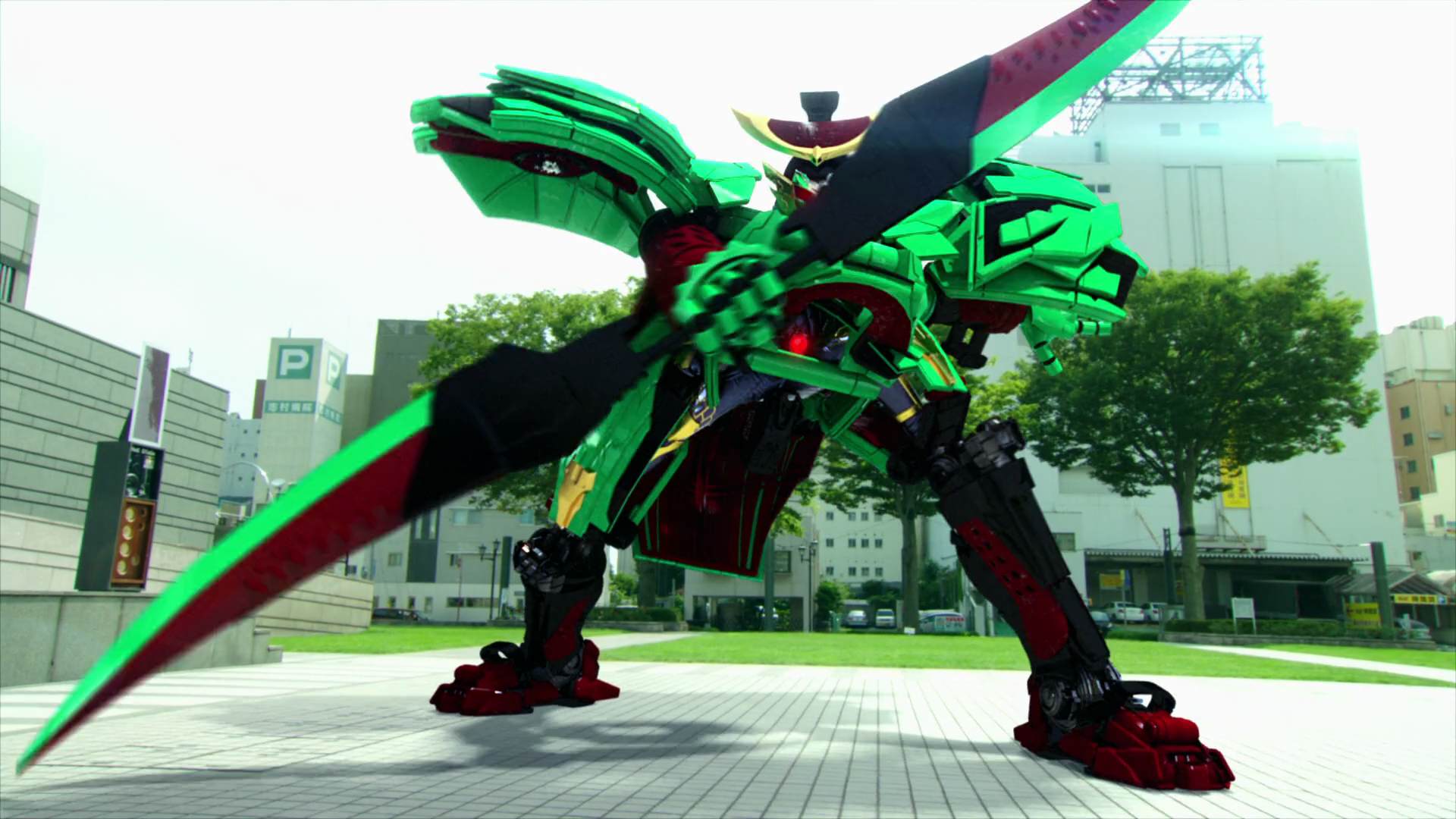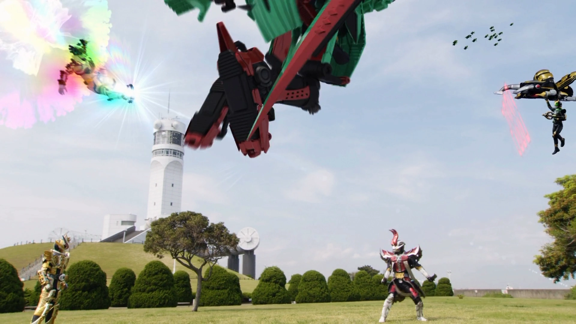 Breaking out of the God Tree in Suika Arms Yoroi Mode with Kamen Rider Wizard on Wizardragon, Gaim proceeded to exit the Suika Arms, leaving it to be kicked in Oodama Mode by Wizardragon's Strike End to against the God Tree, providing an opening for the two Kamen Riders to perform their double Rider Kick and destroy Kamen Rider Bujin Gaim Lotus Position. [Kamen Rider Gaim: Sengoku Battle Royale]