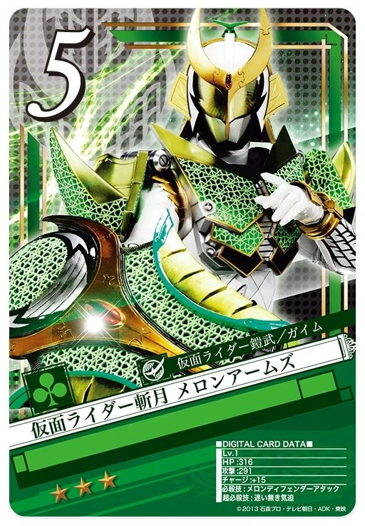 - ↑ 1.0 1.1 "TV Asahi's stats for Zangetsu Melon Arms". http://web.archive.org/web/20160422163813/http://www.tv-asahi.co.jp/gaimu/rider/melonarms_00.html.