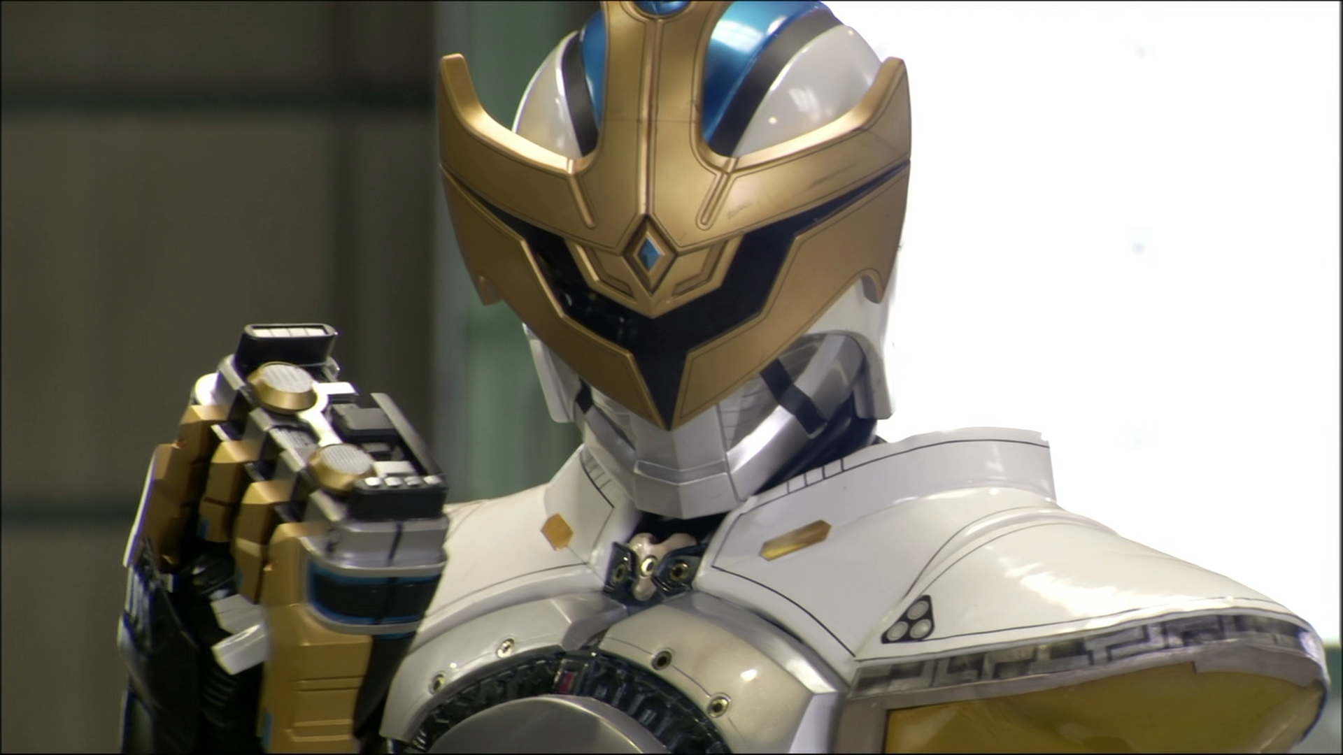 - Sol Flasher (ソルフラッシャー, Soru Furasshā) - The light bars on the shoulders. Energy can be concentrated here to be used as a flash grenade. The amount of light is 3 million candela. The intensity of the flash can lead to blindness in ordinary people with a single shot, making it even more effective against Fangires, who dislike light. Therefore, it can be said that this is specifically anti-Fangire equipment. Additionally, during normal operation, it plays the role of a condition signal that flashes red when a yelow light pops up, a malfunction occurs, or when battery level is significantly reduced.